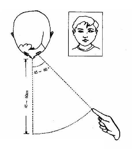 2.闭目直立试验:又称昂白试验(Romberg’s test)。受检者直立,两脚并拢,双上肢下垂,闭目直立,维持30秒,亦可两手于胸前互扣,并向两侧牵拉,观察受检者有无站立不稳或倾倒。前庭周围性病变时,躯干倾倒方向朝向前庭破坏的一侧,与眼震慢相方向一致;中枢性病变时,躯干倾倒方向与眼震慢相不一致。