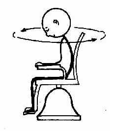 方法:患者坐于旋转椅上,头固定于前倾30°,使外半规管呈水平位置,以每2秒一圈的速度作向右(顺时针)或向左(逆时针)方向旋转10圈后突然停止,嘱患者两眼向前凝视,观察眼震(图2-36)。在顺时针方向旋转后,发生向左的眼震,而逆时针旋转后则为向右的眼震,两次检查至少间隔5分钟。正常者眼震持续时间平均为30秒(15~45秒),两侧相差不超过5秒。