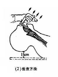 检查方法:①患者取仰卧头高位,肩部靠近手术台缘,全身松弛。小儿要固定四肢。②第一助手坐在患者头右侧,左足踏在梯形木箱上,右手托枕部,左手固定头部,利用大腿的倾斜度调节头位高低,使头部和身体在一条直线上,患者头高于台面约10~15cm,颈向前伸,并随手术操作而活动。③第二助手站在患者左侧,固定其两肩,勿使肩抬起。④嘱患者张口,用纱布保护上唇及上列牙齿,术者左手持镜,沿舌背正中或右侧导入咽部,见会厌于镜之上部,使镜管远端指向咽后壁,但不与之接触,继续深入约1cm,使喉镜尖端置于会厌的喉面下,挑起会厌,左手以平行向上的力量向上提起喉镜即可暴露喉腔,绝不可以上切牙为支点将喉镜向上撬起,以免牙齿受压脱落。⑤按间接喉镜检查的范围观察喉各部情况。在直接喉镜下声带的色泽较间接喉镜所见为深,呈粉红色。由于受检者所处的方位与检查者一致,因此声带左右侧位置和间接喉镜下所见者方位相反。