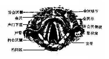 在正常情况下,喉及喉咽左右两侧对称,梨状窝无积液,粘膜呈淡红色,声带呈白色条状。发“依”声时,声带内收,深吸气时,声带分别向两侧外展(图2-12)。
