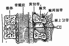 穿刺术有直入法与侧入法两种。病人准备与腰麻同。选择好穿刺间隙后,直入法是在穿刺间隙中点进行,穿过皮肤、棘上韧带和棘间韧带而达黄韧带。侧入法是在离棘突中线约1厘米处进针,针体与背部皮肤垂直,向前直抵椎板,稍退针使针体与正中线倾斜成30度左右角度。腰部穿刺时,针尖向前探索即可抵黄韧带,而胸部穿刺时,针尖应顺着椎板背面逐渐向头端倾斜,以寻找棘突间隙。无论直入法或侧入法,针尖抵黄韧带时均有一种坚实感,阻力增加,突破黄韧带后便有落空感,表明针尖已达硬膜外腔。