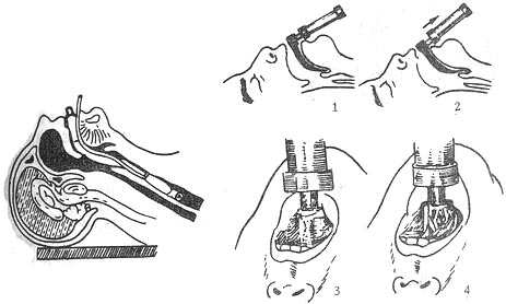3.插管步骤:插管可经口或鼻腔的途径,采用喉镜明视或盲探插入导管,而以口腔明视插管最常用,特殊情况可通过气管造口插管,近年来又开展光导纤维喉镜插管。插管须在麻醉条件下按步骤作(图1-16,1-17):①左手持喉镜沿病人右侧口角置入镜片,将舌体推向左侧后使镜片移至正中,见到悬雍垂。②镜片进入咽喉部并见到会厌。③弯镜片置入舌根与会厌交界外,使病人头向后仰再上提喉镜,随之会厌翘起而显露声门。④将导管经声门裂插入气管内,塞入牙垫后退出喉镜,妥善固定导管和牙垫,接上麻醉机。