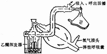 (三)半开放法及半紧闭法 此二种方法的特点是介于开放法和紧闭法之间,呼出气都有一定程度的重复吸入,根据所用的活瓣和气体流量来控制,规定二氧化碳复吸入量半开放式应低于1%,半紧闭式则可高于1%。626型空气麻醉机即属半开放式(图1-21),紧闭法时如将部分呼出气通过呼出活瓣逸出,即成半紧闭式,需有二氧化碳吸收装置,实际工作中二者有时很难区别。