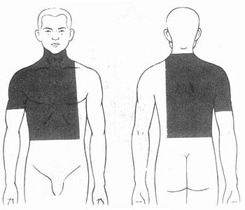 注意事项:①涂擦上述药物时,应由手术区中心部向四周涂擦。如为感染伤口或肛门等处手术,则应自手术区外周涂向感染伤口或会阴肛门处。已经接触污染部位的药液纱布,不应再返擦清洁处;②手术区皮肤消毒范围要包括手术切口周围15cm的区域。如手术时有延长切口的可能,则应适当扩大消毒范围。现将不同手术部位的皮肤消毒范围,用图说明(图2-4~图2-11)。