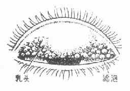 沙眼衣原体主要侵犯睑结膜,首先侵犯上睑的睑板部上缘与穹窿部,以后蔓延至全部睑结膜与穹窿部,最后以瘢痕形成而告终。检查时其特征如下: