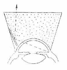 三面镜又名三面反射接触镜,有三个反射面,此镜的中央部分(a)可供检查黄斑部周围30°以内的眼底,三个反射镜面的倾斜度各不相同,镜面(b)与前方平面呈75°倾斜角,可供检查30°至赤道部的眼底;镜面(c)成67°倾斜角,可供检查赤道部至周边部眼底;镜面(d)成59°倾斜角,可供检查前房角和锯齿缘。放置方法是先在被检眼滴0.5%的卡因2~3次,然后把已清洗、消毒的三面镜安放在被检眼上,安装方法同前房角镜使用法(见下节 )。三面镜中看到的眼底是代表对侧的部位。例如镜面在上方看到的是下方眼底,但此时左右关系不变;镜面在右侧,看到的是左侧的眼底,此时其上下的关系不变。如将三面镜顺序旋转则可看到眼底全部。三面镜检查可观察周边部眼底,鉴别出血、囊样变性和视网膜裂孔。压陷接触镜是由三面镜和锯齿缘部巩膜压迫器联合构成,主要使用59°的镜面,利用压迫器在锯齿缘附近向眼球中心压迫,使眼球壁向内突起,可以在瞳孔极度扩大的情况下检查眼底锯齿缘附近的视网膜、锯齿缘、睫状体和玻璃体基部。(图2-11)
