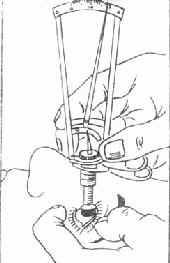 修兹(Schiotz)(压陷式)眼压计测量法,为常用的测量法,测量前应先向被检者作适当的说明,取得被检者的合作,然后让被检者仰卧,两眼滴0.5%的卡因溶液2~3次面面麻醉。测量前应校正眼压计(把眼压计竖立在小园试板上,指针指向零度时方为准确),用75%的酒精消毒眼压计足板,等酒精干后即可使用。检查时被检者两眼自然睁开,向天花板或某一固定目标点(常用被检者自己的手指)直视,勿转动,检者用左手指轻轻分开上、下眼睑并固定在上、下眶缘,切勿压迫眼球,右手持眼压计的把手,将眼压计垂直下放,将足板轻轻放在角膜正中央(使眼压计自身重量完全压在角膜上,但注意切不可施加任何其他压力),迅速记录眼压计指针所指刻度,将此刻度对照眼压计换算表,查出眼压值。此种眼压计一般有三种不同重量的砝码5.5克、7.5克、及10克。通常先用5.5克检查,如指针刻度小于3,则应加重砝码重测,一般先后测5.5克及10克两个砝码,以便相互核对及校正眼压。测完后滴搞生素眼药水,拭净眼压计足板。(图2--10)