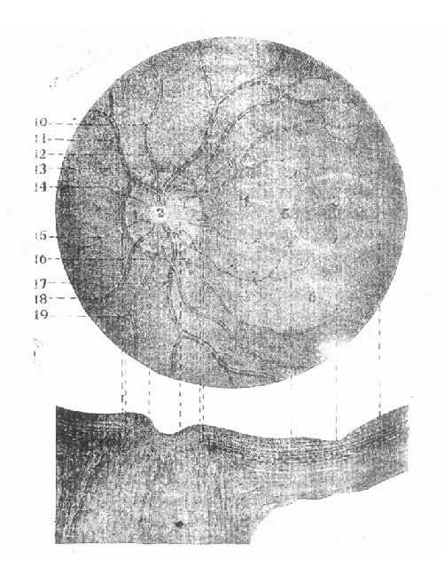 1.视盘 2.生理凹陷 3.黄斑部中心凹光反射 4.黄斑部 5.黄斑反射轮6.视网膜 7.黄斑静脉 8.黄斑动脉 9.色素轮 10.上鼻侧动脉11.上鼻侧静脉 12.上颞侧动脉 13.上颞侧静脉 14.内侧静脉15.内侧动脉 16.下颞侧动脉 17.下颞侧静脉 18.下鼻侧静脉19.下鼻侧动脉