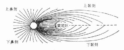 2.视神经:上述排列情况在视神经中一直保持到球后10~~15mm处。此后盘斑束纤维转入视神经中央部,颞侧周边部纤维则位于视神经颞侧、鼻侧纤维仍在鼻侧。