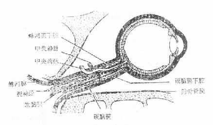 视神经的外面有神经鞘膜包裹,是由三层脑膜(硬脑膜、蛛网膜、软脑膜)延续而来。硬脑膜下与蛛网膜下间隙前端是盲端,止于眼球后面,鞘膜间隙与大脑同名间隙相同,其中充有脑脊液。临床上颅内压增高时常可引起视盘水肿,而眶深部感染也能累及视神经周围的间隙而扩散到颅内(图1-20)。