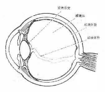 (三)玻璃体(vitreous):为透明、无血管、无神经具有一定弹性的胶体。充满在晶状体后的空腔内,是眼屈光间质之一。前面有一凹面称玻璃体凹,晶体后面座落其内,其它部分与视网膜和睫状体相贴,其间以视盘周围和锯齿缘前2mm处结合最紧密。在玻璃体中央可见密度较低的狭长漏斗状管,称玻璃体管(Cloquet管),在胚胎时有玻璃体动脉通过(图1-19)。玻璃体主要由胶原纤维及酸性粘多糖组成,其表层致密,形成玻璃样膜。