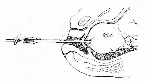 2.阴道分娩 阴道分娩是利用胎先露部压迫胎盘达到止血目的,此法仅适用于边缘性前置胎盘而胎儿为头位。在临产后发生出血,但血量不多,产妇一般情况好,产程进展顺利,估计在短时间内可以结束分娩者。决定阴道分娩后,行手术破膜,破膜后胎头下降,压迫胎盘,达到止血,并可促进子宫收缩,加速分娩,此方法对经产妇的效果较好。如破膜后先露下降不理想,仍有出血,可采用头皮钳牵引(图93),臀牵引、横位内倒转或剖宫术者。
