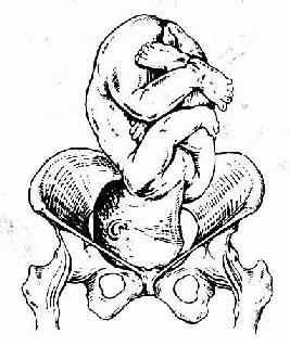 (2)胎先露 分娩时,胎儿最先进入骨盆入口的部分叫“先露部”。头位的先露部可因胎头俯屈良好、俯曲不良及仰伸等不同情况,分为顶先露、额先露及面先露等,其中以顶先露最常见,额及面先露少见(图23、26)。臀位的先露部为臀,因胎儿下肢屈曲程度的不同可分为盘腿臀先露、伸腿臀先露以及足或膝先露等(图24)。横位的先露部为肩,又称肩先露(图25)。