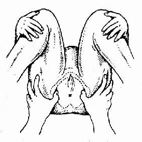 图38 检查耻骨弓形状及 宽度