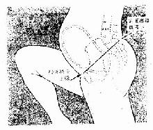 图33骶耻外径侧卧测量法 (上腿伸直、下腿屈曲)