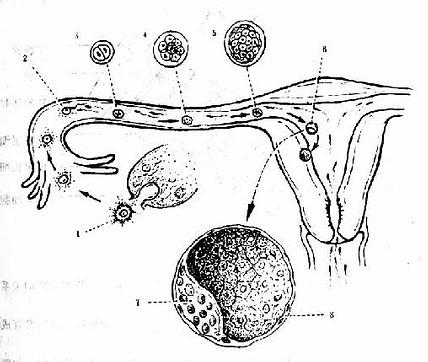 1 排卵 2 受精 3 合子 4 卵裂球 5 桑堪球 6 胚泡7 内细胞群 8 原始滋养层