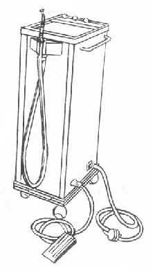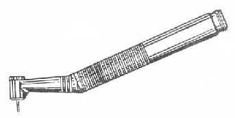 可装备于综合治疗上或单独成活动式,为超高速机,在压缩空气正常工作压力下, 牙钻转速可达(3-5)×10r/min。空气要由空气压缩机、控制盒(包括空气过滤器,油雾器,储水灌等)和脚踏开关组成。空气压缩机压力正常情况下可升到0.4MPa以上,排气量不低于32L/min,传至手机的气压约0.2-0.25MPa。压缩机传出的空气,经空气过滤器后,分两路;一路经油雾器,使润滑油雾化后,随压缩空气喷至手机涡轮,使其转动,另一路通向水罐,使水经手机喷水孔至牙钻上,达到喷水冷却。气压和水压均可调节。(图2)