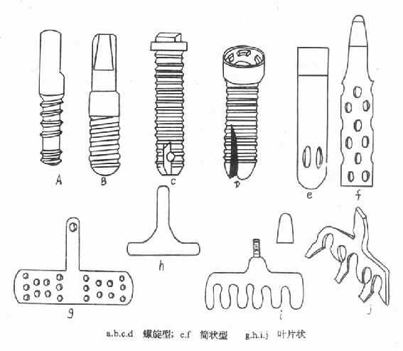 牙种植体又称人工牙根,是用人工材料制作成的装置,将其植入上颌或下颌牙槽骨内或表面,并以此为基础,完成义齿修复,恢复咀嚼、说话、外形等功能。目前牙种植体有三类,即骨内种植体面(Eneosseous Impant)、骨膜下种植体(Subperiosteal Implant )、牙内骨内种植体(Endodontic Endosseous )。近年来临床应用最多的是骨内种植体,常用者有螺旋型、简状型及叶片型等(图5-15)。