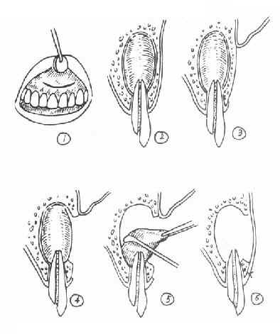 ④凿去骨壁,暴露囊肿 ⑤摘除囊肿 ⑥缝合伤口,患牙作根管治疗并修复