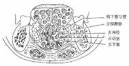 手术方法:在局麻下,于舌下皱壁的外侧,沿导管走行的方向,前至下颌尖牙相对部位。后至第一磨牙远中相对部位,作一弧形切口(图3-32),分离显露舌下腺,完整的切除舌下腺及腺体周围的囊壁。术中要防止损伤颌下腺导管、舌神经、舌动脉和舌静脉(图3-33)。缝合伤口后应放置橡皮片引流。