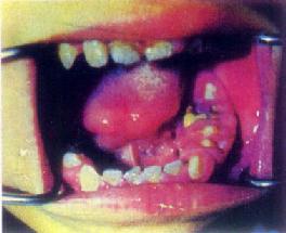 通常先起于一侧口底舌下区(附图22),增大时可扩展于对侧,有时也可扩展至颏下或同侧颌下部。囊肿位于口底粘膜的深面,呈淡黄色、半透明的柔软包块。触诊有波动感,无压痛。增长缓慢。囊肿很大时,可影响说话、吞咽甚至呼吸。如并发感染可有疼痛等炎症表现。囊肿破裂时,溢出蛋清样粘稠液体,包块消失,但可复发。