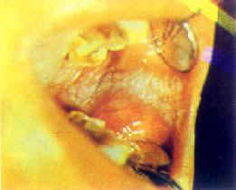 (二)重型(大型)口疮:该型又称复发坏死性粘膜腺周围炎(Periadenitis.Mucosa Necroti-ca Recurrens,PMNR)或腺周口疮。此型较少见,溃疡面大而深,直径可达10~30mm,深及粘膜下层的粘液腺或腺周组织,溃疡底微硬,边缘不齐且微显隆起(附图3),愈合后常留下疤痕,溃疡疼痛较剧,病程可长达数月或更久,但仍有自限性、复发性,这型溃疡有由口腔前份向后份发展的倾向,经多年发作后溃疡常发生在舌腭弓、软腭、悬雍量等部位,溃疡数目为1~2个大溃疡,周围或有数个小溃疡,患者全身情况好。此型可通过溃疡的好发部位、溃疡特点、有无复发性、自限性、全身情况及活检与特异性溃疡或肿瘤鉴别。