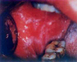 (二)接触性口炎:主要是Ⅳ型变态反应引起,常见致敏物质有甲基丙烯酸甲酯,自凝丙烯酸酯、银汞合金、唇膏、泡泡糖等。在接触致敏物质半天甚至24h以上,再接触过敏原即可发生反应,接触部位粘膜发红、水肿、在红斑上中发生水疱,糜烂或溃疡、自觉灼痛。临床上用银汞合金作充填术后可见在接触的粘膜上出现类似扁平苔藓病损,去除银汞充填物改用树脂充填,则病损可消退。