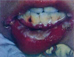 (二)疱疹性口炎:多见于6岁以下儿童,尤其是6个月至2岁,多为原发性。开始多有发烧、头痛、全身不适等先驱症状,2~3天后口腔开始出现症状,初起口腔粘膜呈片状充血,随后出现成簇的小水疱,水疱迅速破裂,形成表浅的小溃疡,直径约1~2mm,溃疡可相互融合成边缘呈多环状的较大溃疡,上有假膜覆盖,颌下淋巴结肿大,患儿因痛而哭闹、拒食、流涎、病程一般1~2周,有的病损延及牙龈,牙龈边缘红肿易出血,甚至出现小溃疡,又称疱疹性龈口炎(附图4)