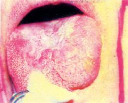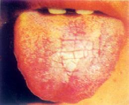 舌炎:早期舌有干燥感、灼热感或刺痛,然后舌体肿大,呈鲜红色(品红),菌状乳头肿胀、充血。接着先是丝状乳头,继而菌状乳头萎缩消失,使舌面变得光滑、发亮呈萎缩性舌炎,有的患者可见舌面裂纹或小溃疡。有的患者可出现口腔粘膜溃疡。