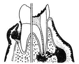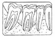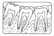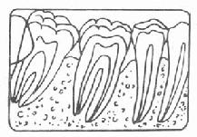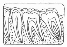 牙周袋形成:由于炎症的扩展,牙周膜被破坏,牙槽骨逐渐吸收,牙龈与牙根分离,使龈沟加深而形成牙周袋。可用探针测牙周袋深度。X线检查时可发现牙槽骨有不同程度的吸收。如图3-7~11.