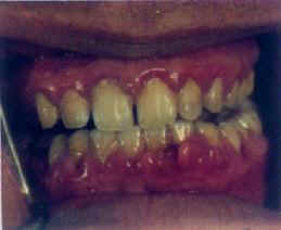 牙龈肿胀肥大,呈深红色或暗红色,组织松软,探诊易出。牙龈乳头呈球状突起(附图1)。肿胀的牙龈常可覆盖前牙唇的1/3或更多。由于牙龈肥大,使龈沟加深而形成龈袋,袋内易藏食物,细菌易滋生,自洁作用差,故炎症加重,可有深性分泌物。若身体抵抗力降低时,可出现单发或多发性的龈脓肿,特别以龈乳头区较多见。