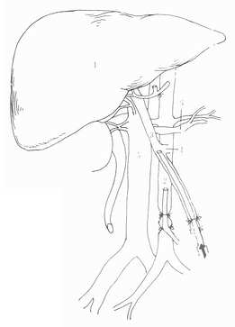1.预置灌注管 经过充分探查,确定供肝可以使用后,迅速在肾动脉以下分离出腹主动脉,插入灌注管,可以将远端腹主动脉结扎。这样,可以确保腹腔动脉、肠系膜上动脉和肾动脉的血供。然后游离出肠系膜上静脉,也置入灌注管(图5-3)。为了确保门静脉血流的灌注,在开始灌注前,不能结扎肠系膜下静脉和脾静脉。如果采用腹部大“十”字形切口,应行左侧开胸,于膈上胸主动脉预置辛氏钳备用。在血液循环稳定的情况下,可以开始切取供肝。