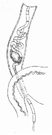 6.套石术:输尿管中下段结石直径小于0.6厘米,可试行经膀胱镜用特制的套篮或导管套取(图6-27,6-28)。