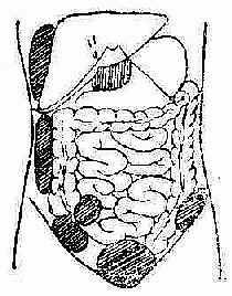 ③经侧胸部引流:适用于右肝上间隙的高位膈下脓肿,此途径须经过胸腔肋膈角部分,除非原有胸膜疾病此处已粘连闭合,否则均应分二期进行。第一期在侧胸部第8或第9肋处作切口并切除一小段肋骨直至胸膜。然后用碘仿纱布和酒精纱布填塞伤口,使引起周围粘连一周后再行第二期手术时即可在穿刺定位后,切开已粘连的胸腔肋膈角,直达脓肿置管引流。