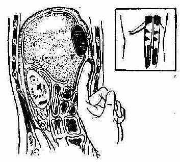 位后,用2%红汞消毒该处,随即在隆起处用穿刺针向前上方刺入。