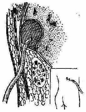 图2-45 抽得脓液后穿刺暂不拔出,用刀尖沿穿刺方