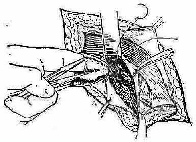[治疗] 直疝多采用手术疗法。手术要点:加强腹内斜肌和腹横筋膜的抵抗力,以巩固腹股沟管的后壁。直疝修补方法,基本上与斜疝相似(图2-28、29)。常用 Bassini法,如果在手术过程中,发现腹横筋膜缺损很大,不能直接缝合时,可利用自身阔筋膜、腹直肌前鞘,以及尼龙布等材料,作填充缺损成形术。