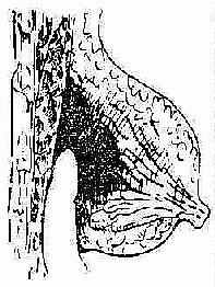 急性乳房炎脓肿形成期,治疗要则是及时切开引流,排出积脓。切开引流应注意如下要点:(1)为避免手术损伤乳管而形成乳瘘,切口应按轮辐方向作放射状切开,至乳晕处为止;深部脓肿或乳房后脓肿,可沿乳房下缘作弧形切口,经乳房后间隙引流之;既可避免乳管损伤,亦有利于引流排脓。乳晕下脓肿,应作沿乳晕边缘的弧形切口。(2)若炎症明显而未见波动处,不应消极等待,应在压痛最明显处进行穿刺,及早发现深部脓肿。(3)脓肿切开后,应以手指深入脓腔,轻轻分离其间的纤维间隔以利引流彻底。(4)为使引流通畅,可在探查脓腔时,找到脓腔的最低部位,别加切口作对口引流。(图2-12,2-13,2-14)。