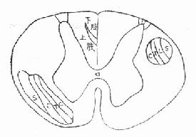在分析运动和感觉传导障碍时,应注意它们发展的顺序和方向,有助于鉴别髓内与髓外肿瘤。脊髓的麻痹可分为上行性和下行性两类。由于脊髓内感觉及运动通路的纤维排列层次关系(图4-41),上行性麻痹的特点是运动和感觉障碍是从肢体的远端开始的,因为最初肿瘤的压迫仅累及脊髓最表面的长传导束纤维,而后才影响到深部的短传导束纤维。上行性麻痹常见髓外肿瘤。下行性麻痹常见于髓内肿瘤,其特点是感觉、运动障碍由上向下发展。因髓内肿瘤首先压迫的脊髓深部纤维。此外应注意会阴部的感觉障碍特征,髓外肿瘤后期,当肢体感觉消失时,在会阴部,外生殖器和肛门外常发现皮肤感觉、尤其疼痛感觉依然存在。而在髓内肿瘤感觉障碍常包括会阴部。