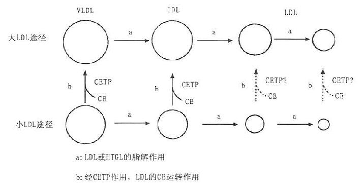 因CETP的缺陷可引起高HDL血症,其中出现有富含ApoE和CE的类似于HDLc的多相分散LDL(polydisperse LDL)。利用平衡密度梯度超速离心可使这种多相分散LDL显示出16个亚组份。采用聚丙烯酰胺梯度凝胶电泳,血胆固醇水平正常的人LDL仅显示一个单一的区带。若CETP缺乏者,LDL可显示两条区带,其后进一步阐明,这两个区带是属于密度相同,其理化性质有差异的大小两种颗粒的LDL。究其原因,是因为LDL的成熟过程有大LDL和小LDL途径,如图7-5所示。ECTP的作用是促使HDL的CE转运到LDL中,使其形成成熟均一的LDL,CETP是LDL成熟的必]需因素。