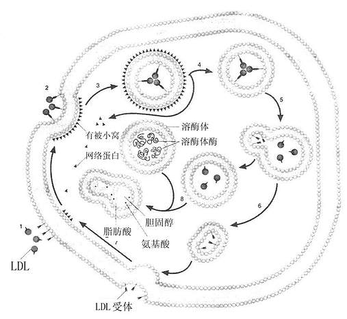 LDL或其他含ApoB100,E的脂蛋白如VLDL、β-VLDL均可与LDL受体结合,内吞入细胞使其获得脂类,主要是胆固醇,这种代谢过程称为LDL受体途径(LDl receptor pathway),该途径依赖于LDL受体介导的细胞膜吞饮作用完成,如图6-3所示。当血浆中LDL与细胞膜上有被区域(coated region)的LDL受体结合(第1步),使其出现有被小窝(coated pit)(第2步),并从膜上分离形成有被小泡(coated vesicles)(第3步),其上的网格蛋白(clathrin)解聚脱落,再结合到膜上(第4步),其内的pH值降低,使受体与LDL解离(第5步),LDL受体重新回到膜上进行下一次循环(第6、7步)。有被小泡与溶酶融合后,LDL经溶酶体酶作用,胆固醇酯水解成游离胆固醇和脂肪酸,甘油三酯水解成脂肪酸,载膜蛋白B100水解成氨基酸,见图6-4。LDL被溶酶体水解形成的游离胆固醇再进入胞浆的代谢库,供细胞膜等膜结构利用。胞内游离胆固醇在调节细胞胆固醇代谢上具有重要作用:若胞内浓度升高,可能出现下述几种情况:①抑制HCGCoA还原酶,以减少自身的胆固醇合成;②抑制LDL受体基因的表达,减少LDL受体的合成,从而减少LDL的摄取,这种LDL受体减少的调节过程称为下调(down regulation);③激活内质网酰基CoA胆固醇酰基转移酶(acyl-Coa cholesterol acyltransferase,ACAT),使游离胆固醇在胞浆内酯化成胆固醇酯贮存,以供细胞的需要。经上述三方面的变化,用以控制细胞内胆固醇含量处于正常动态平衡状态。血浆中胆固醇主要存在于LDL中,而65%~70%的LDL是依赖肝细胞的LDL受体清除。肝脏的LDL受体还影响LDL的合成速率及VLDL代谢。曾经认为人VLDL几乎全部在血循环中转变为LDL,LDL再被肝外组织摄取,现在经大鼠和兔实验研究表明,VLDL仅有15%以下转变为LDL,人则有<50%的VLDL转变为LDL,大部分VLDL是以VLDL或VLDL残粒的形式被肝脏摄取。VLDL残粒与肝脏受体的亲和力比VLDL大很多,VLDL中虽有少量ApoE,因含有丰富的ApoC,可掩盖ApoE,而阻碍其与肝脏的ApoE、E受体结合,因VLDL转变成VLDL残粒时,随着甘油三酯水解而丧失ApoC,暴露出ApoE,因此,VLDL残粒被肝清除的速率比VLDL快。VLDL残粒大部分被肝脏清除,一小部分在肝脂酶作用下水解除去甘油三酯而转变成LDL。LDL受体还在乳糜微粒代谢中起有一定作用。由于乳糜微粒中的ApoB48不能识别ApoB100,E受体。所以肝脏不能清除完整的乳糜微粒。但是血管中乳糜微粒被脂蛋白脂肪酶水解去除其大部分甘油三酯核心后,同时丧失部分ApoC、A,生成乳糜微粒残粒除去了阻碍ApoE与受体结合的因素,故可迅速被肝脏清除。LDL约有一半是通过LDL受体,另一半通过LDL受体相关蛋白进行代谢,其半寿期短,