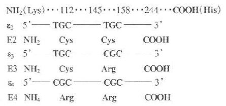 图3-3 人ApoE三种主要异构体的氨基酸残基及基因密码的改变位置