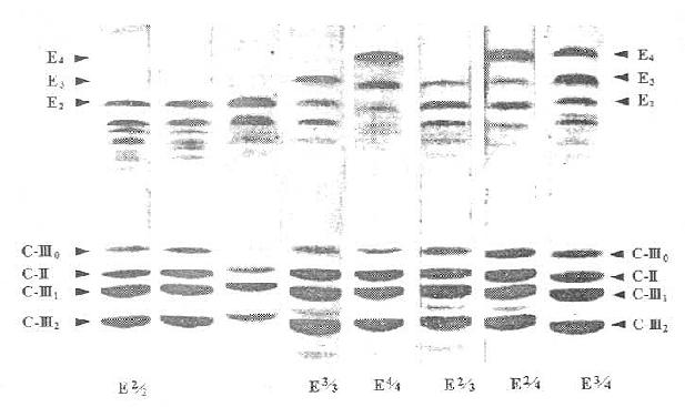 Utermann等于1975年首先观察到ApoE多态性,利用等电聚焦电泳和SDS-PAGE可以确认ApoE的多态性,其后又被直接检测的cDNA序列所证实。ApoE有三种构体(isoform)即E2、E3和E4。有的人只含有一种主要异构体,即为纯合子;有人可含两种主要异构体,即为杂合子。由此可见,人群中可有六种不同的表型(phenotype)。