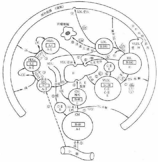 另外,体内肝将糖及游离脂肪酸合成TG(内源性TG),再与Ch、ApoB100、ApoCⅡ及ApoE等结合形成VLDL释放入血中(图中⑤),血中VLDL再接受HDL上转移的ApoCⅡ、E(图中⑥)又在各组织毛细血管壁的LPL作用下,使其核心的TG不断水解(图中⑦),而后转变成LDL或者VLDL残粒,大部分被肝摄取,也可能被肝外摄取一小部分。血浆中VLDL很不均一,大颗粒的含TG高者可迅速清除,仅10%左右转变成LDL;小颗粒含TG少的VLDL清除较慢,40%转变成VLDL残粒。经肝细胞的LDL受体摄取(图中⑧),一部分又经LPL和HL作用水解TG成脂肪酸,供组织细胞利用,使其表面积缩小,并变成ApoB100为主的LDL。LDL一部分经肝及肝外LDL受体识别摄取入肝内(图中⑨);一部分氧化后经肝及肝外组织清道夫受体识别入肝外组织细胞(图中⑩)。