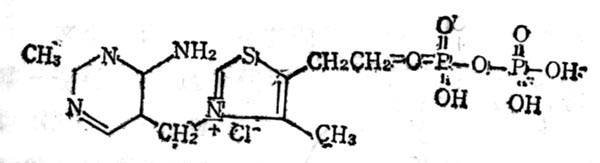 维生素B1又称硫胺素(Thiamine VB1),在室温下与中性亚硫酸钠溶液中分解嘧啶和噻唑两部分(图5-10)。它与焦磷酸生成硫胺素焦磷酸(Thiamine pyrophosphate,TPP),即羧化辅酶(cocarboxylase),这个反应需要ATP参加,结构式见图5-11。TPP参与糖代谢中α酮酸的氧化脱羧作用。