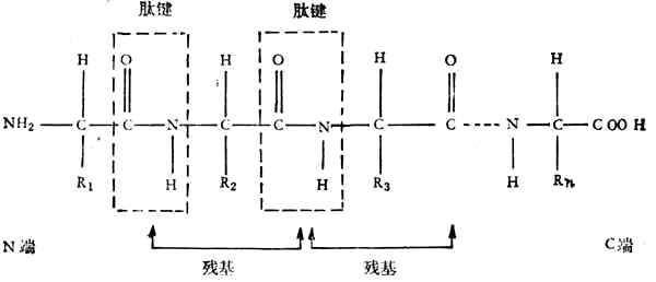由于氨基和羧基都在α-C上,故称为α-氨基酸。式中R表示侧链。侧链不同,氨基酸的种类就不同。组成蛋白质的氨基酸一共有20种,各氨基酸按一定的排列顺序由肽键(酰胺键)联结成长链。肽键是由一个氨基酸残基的α-羧基和另一个氨基酸残基的α-氨其组成,如下所示: