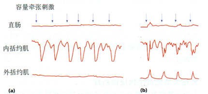 (c)直肠受牵张刺激后肛门内、外括约肌反应协调性丧失。