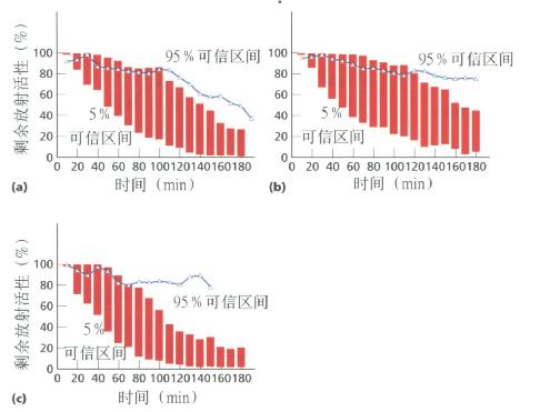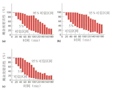 将各个10分钟间隔的连续时间段放射性活性剩余量与正常30例自愿者相应时间段5%及95%可信区间进行比较。