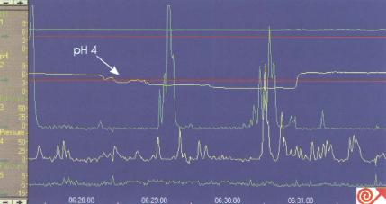 12患者次日返回实验室,先检查导管位置再拔出导管。一例食管pH及动力联合检测,如图8.53。