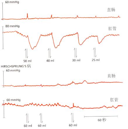 图6.2 Hirschsprung病患者与正常人肛管压力对直肠扩张反应曲线。双箭头表示1秒内